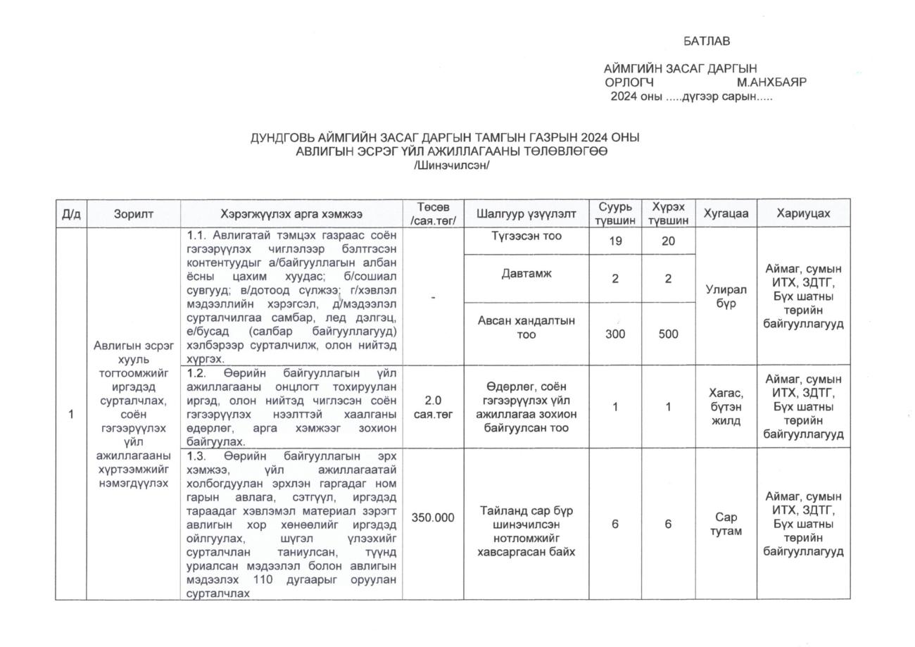 ДУНДГОВЬ АЙМГИЙН ЗАСАГ ДАРГЫН ТАМГЫН ГАЗРЫН 2024 ОНЫ АВЛИГЫН ЭСРЭГ ҮЙЛ АЖИЛЛАГААНЫ ТӨЛӨВЛӨГӨӨ /Шинэчилсэн/