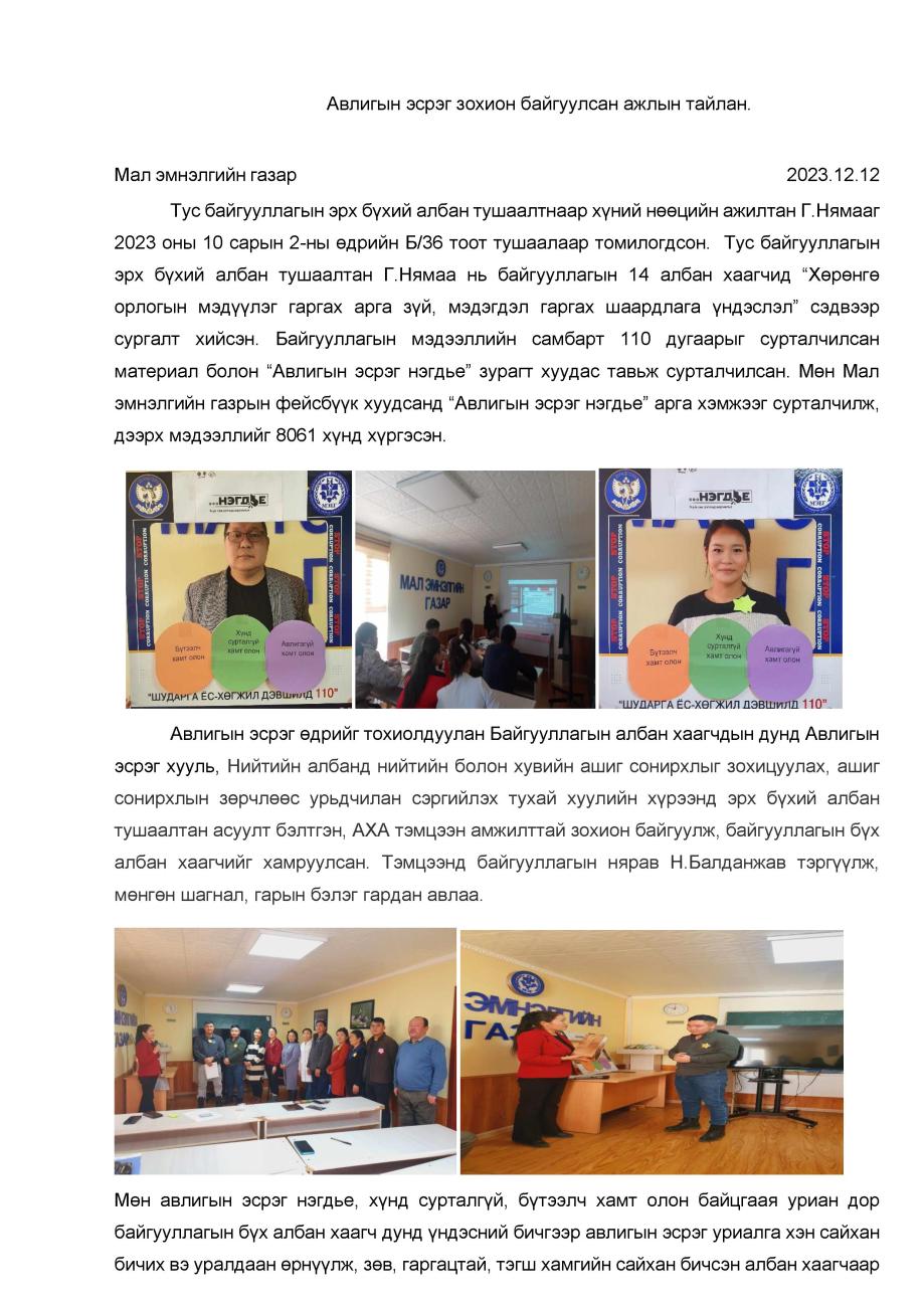 Авлагын эсрэг зохион байгуулсан ажлын тайлан.