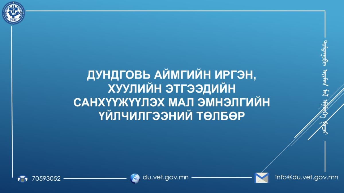 ДУНДГОВЬ АЙМГИЙН ИРГЭН, ХУУЛИЙН ЭТГЭЭДИЙН САНХҮҮЖҮҮЛЭХ МАЛ ЭМНЭЛГИЙН ҮЙЛЧИЛГЭЭНИЙ ТӨЛБӨР
