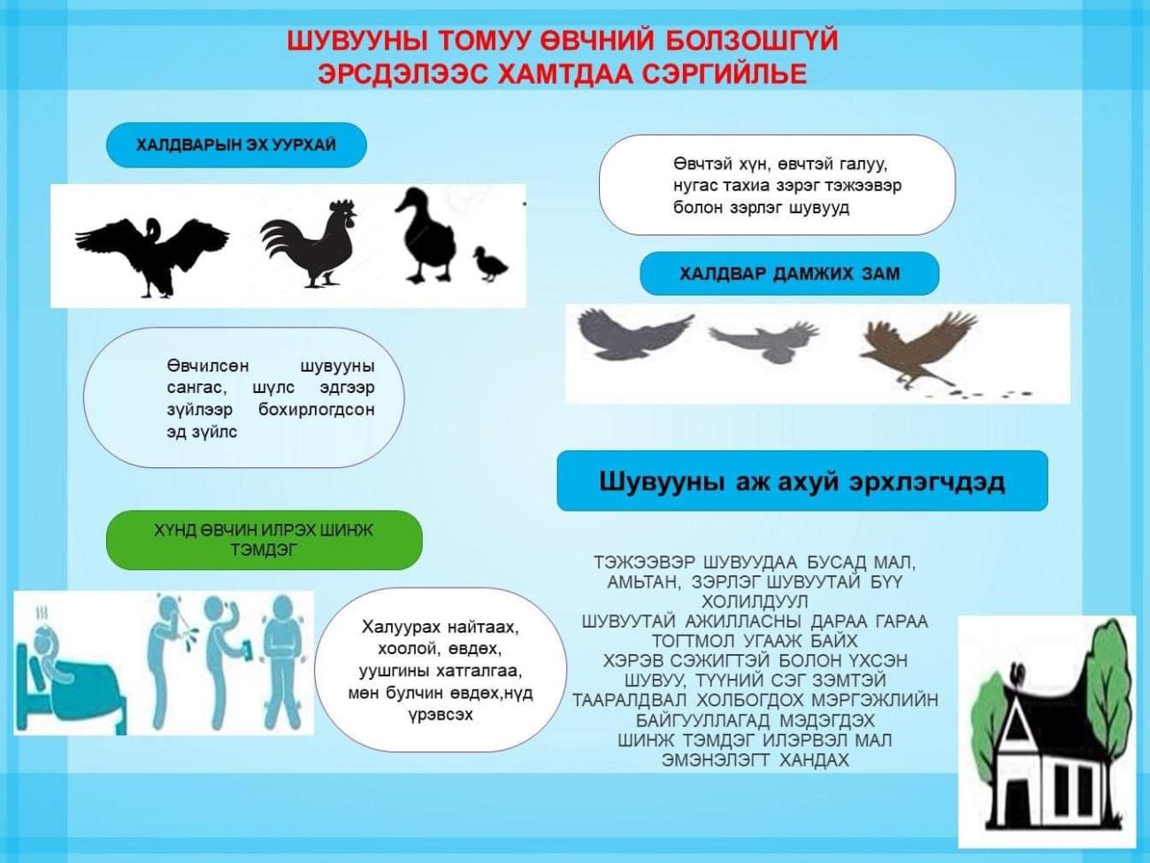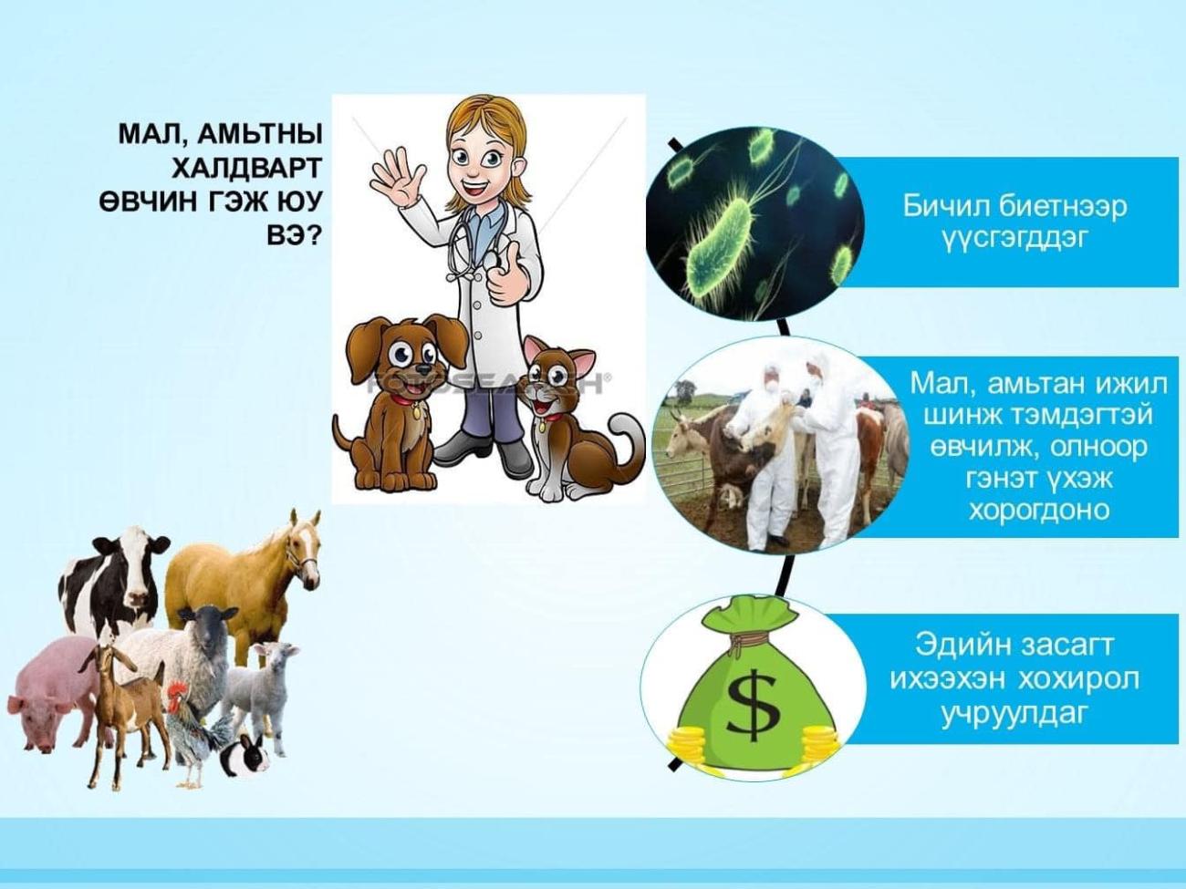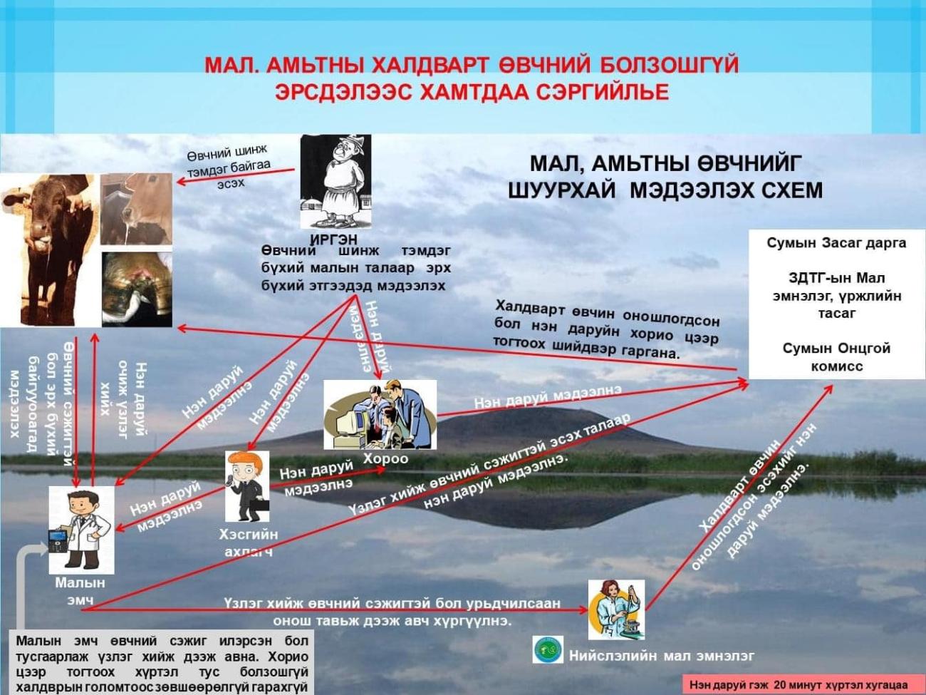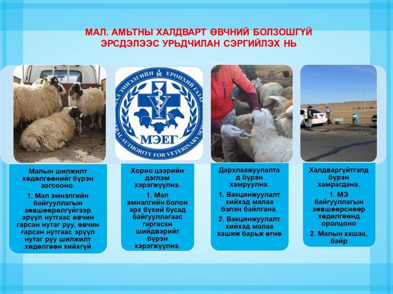 Мал, амьтны гоц халдвар өвчнөөс урьдчилан сэргийлэх сэрэмжлүүлгийг сумдын мал эмэлгийн тасаг, нэгжийн эмч нараар дамжуулан малчдад хүргэх ажлыг өргөн хүрээтэй зохион байгуулж ажиллахыг эрүүл мэндийн албадын дарга нар, сумдын тархвар зүйч нар, мал эмнэлгийн улсын байцаагч нарт үүрэг болгож байна.