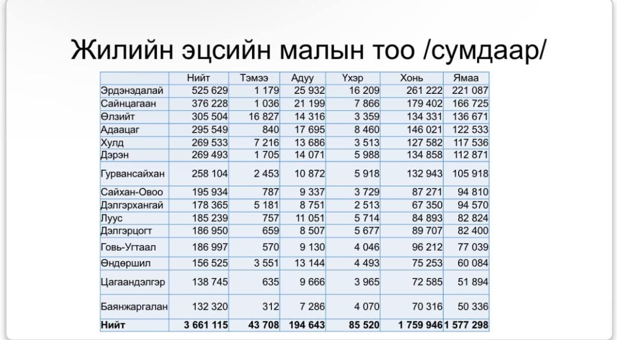 ЖИЛИЙН ЭЦСИЙН МАЛЫН ТОО /сумдаар/