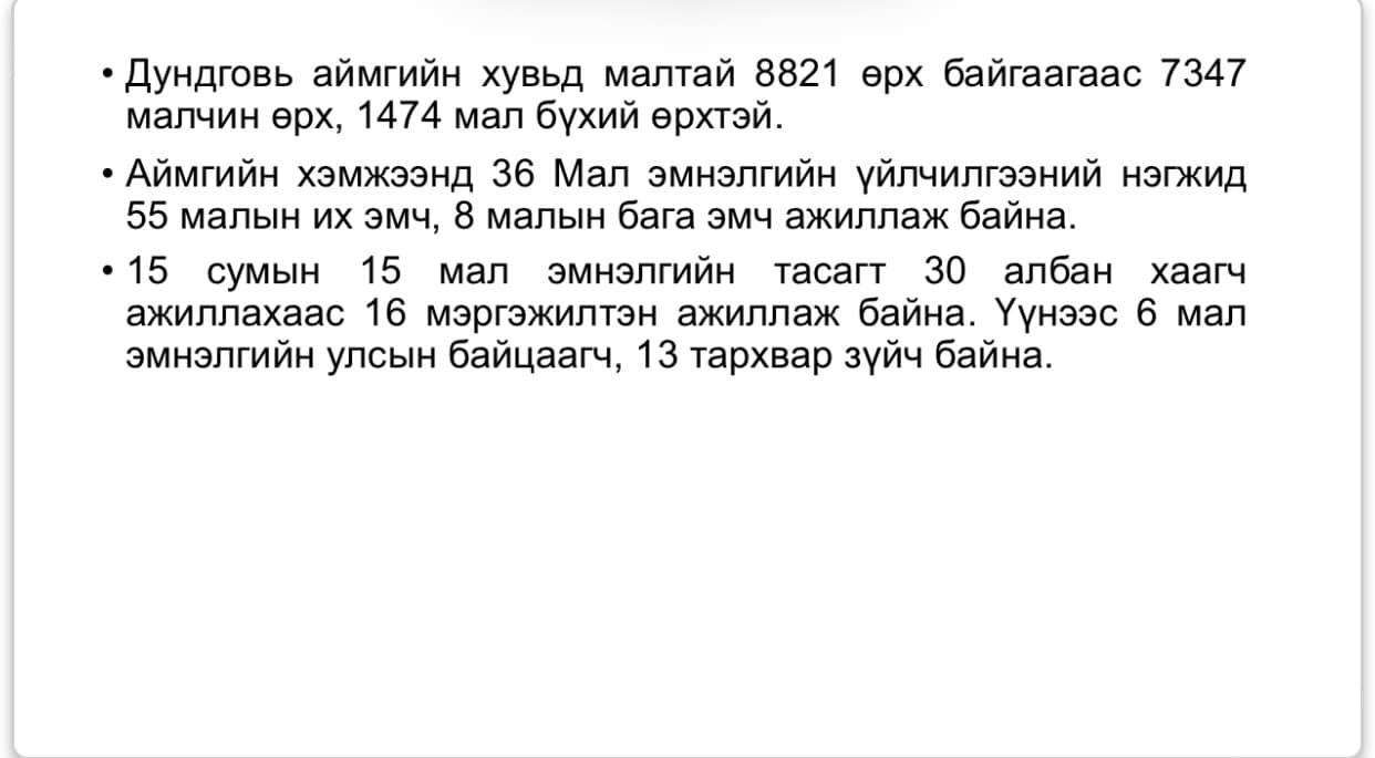 МАЛЧИД, ТЭЭВЭРЧИД, АРД ИРГЭДИЙН АНХААРАЛД: Өнөө шөнө буюу 11 дүгээр сарын 25-наас 26-нд шилжих шөнө болон маргааш өдөр Дундговь аймгийн нутгийн зүүн хэсгээр ялимгүй цас орж, цасан шуурга шуурна. Салхи 26-ны өдөр баруун хойноос секундэд 14-16 метр, 27-ны өдөр нутгийн төв болон зүүн хэсгээр 18-20 метр, зарим үед 24 метр, бусад сумдаар 12-14 метр хүрч ширүүсэх тул болзошгүй аюулаас сэрэмжтэй байхыг анхааруулж байна. Дундговь УЦУОШТөв
