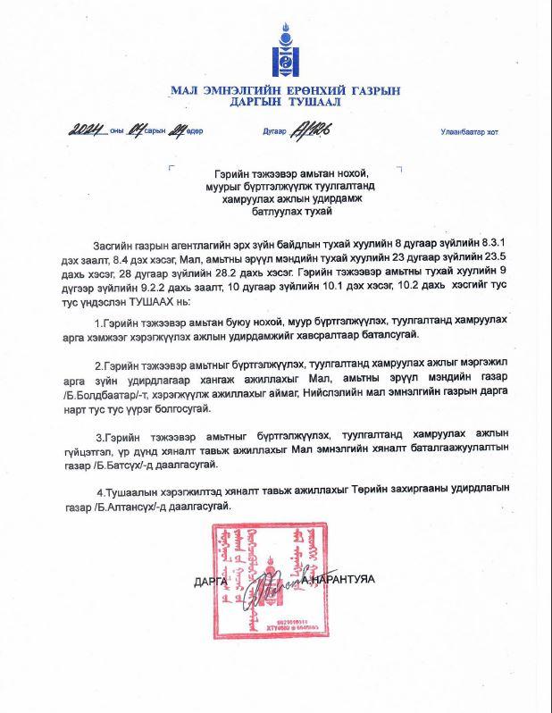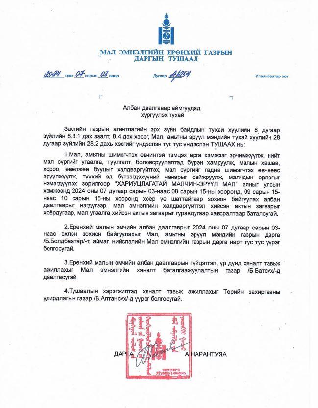 ХАРИУЦЛАГАТАЙ МАЛЧИН-ЭРҮҮЛ МАЛ АЯН ЗОХИОН БАЙГУУЛАХ ТУХАЙ